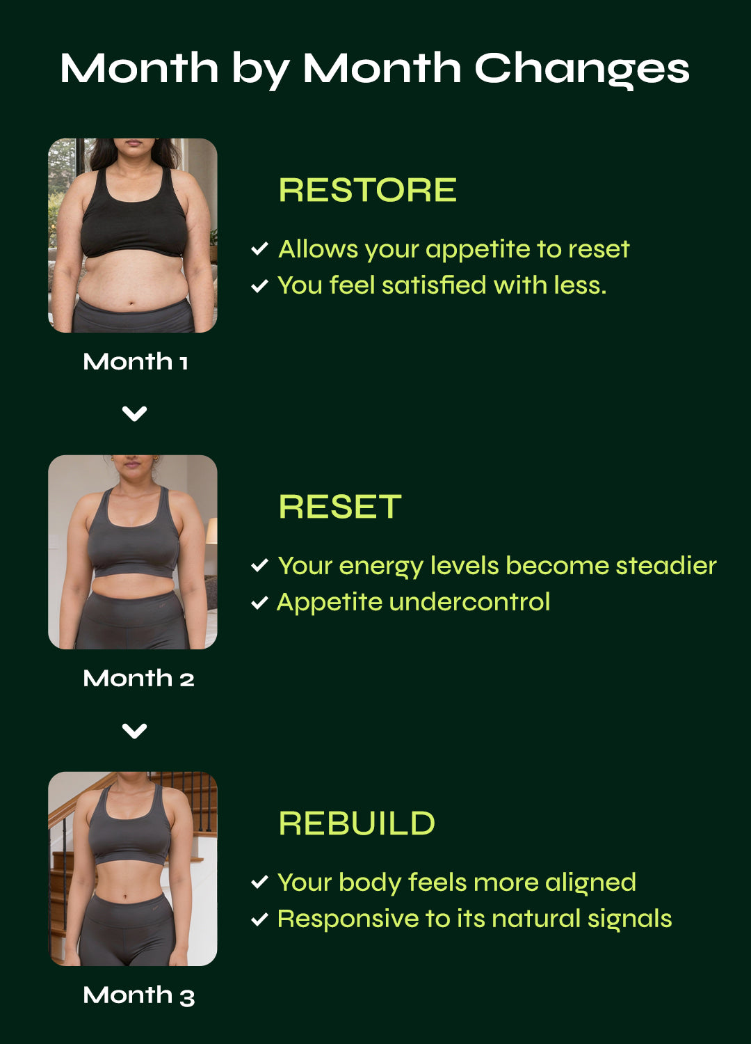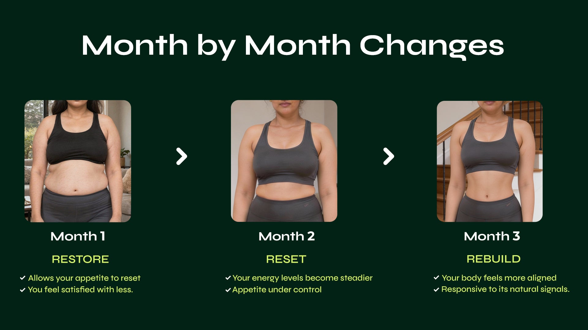 Cravings ease within weeks, and with a balanced diet, regular exercise, and consistent use, visible changes appear in 2–4 months.