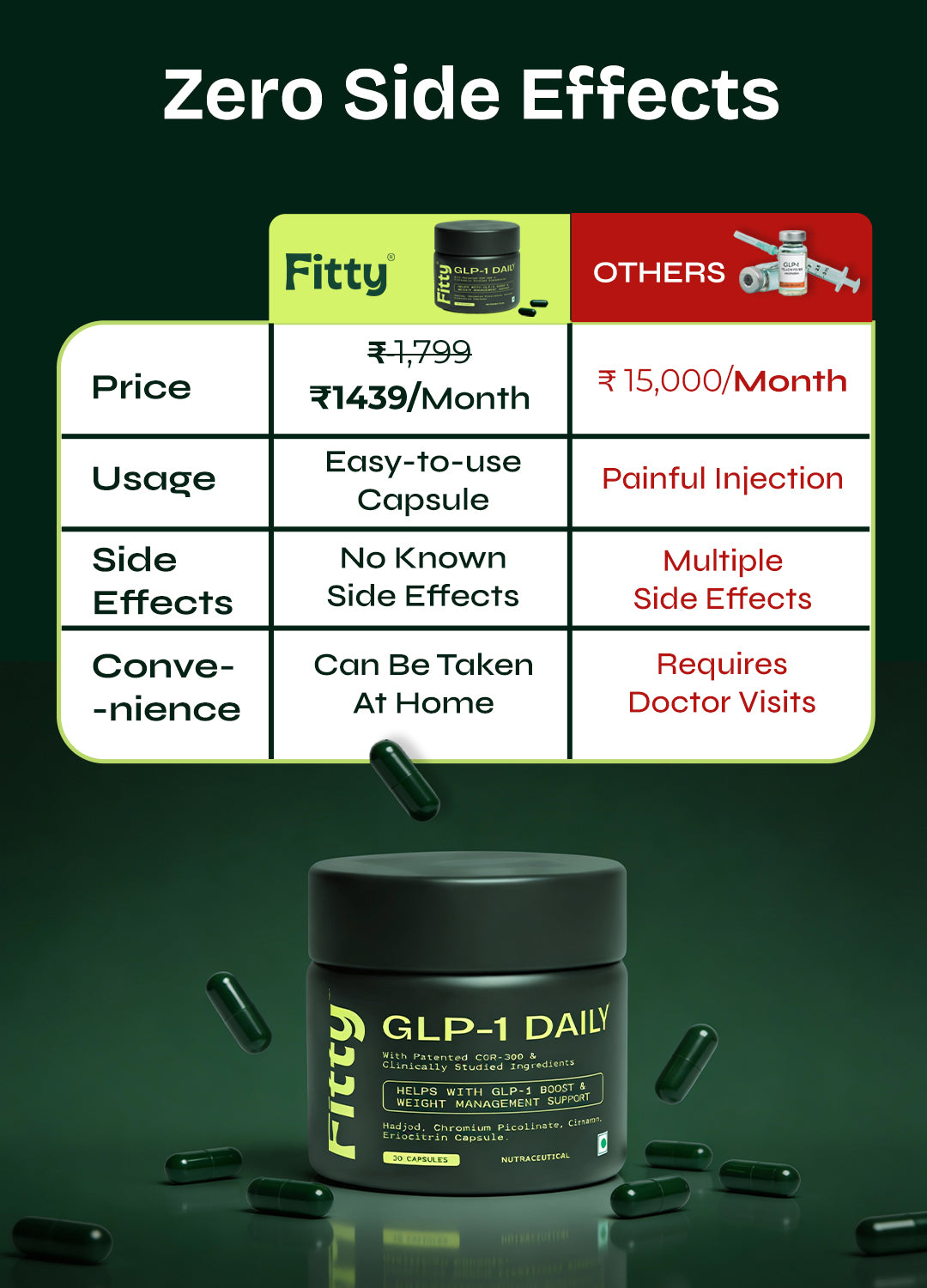 Fitty GLP-1 Daily is designed to naturally boost and protect your GLP-1 levels, helping you feel full, eat less, and lose weight sustainably.